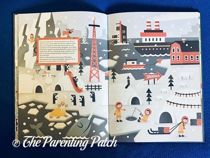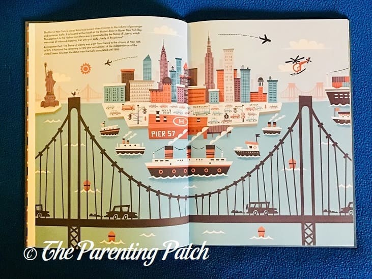 My oldest daughter, who just finished her second-grade level work, easily read the book on her own with just a little bit of help with the biggest words. My four-year-old preschooler likes looking at the pictures as I read the text aloud to him. My toddler daughter likes to look at the pictures along with her big brother. The biggest draw for me are definitely the illustrations. I absolutely adore the 1950s-inspired style, which gives the book a cool retro feel that is totally in at the moment. I could spend hours poring over the details on each page. Great Ports of the World has found a place on the favorites bookshelf in The Parenting Patch household!